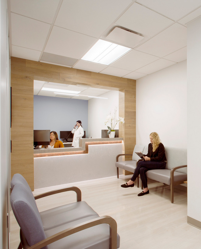 The interior color palette consists of mostly white with a combination of tan, gray and blue hues that provide a light and relaxing aesthetic. Modern linear pendants, along with textured upholstery and wood details, provide the space with a level of warmth, while maintaining the calm and clean environment appropriate for a clinic.