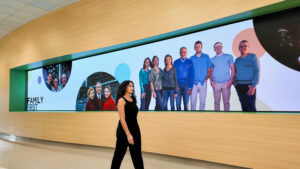 DI’s work extends beyond the interactive digital wall to honor donors past and present. A 47-foot-long LED screen and a complementary floor-to-ceiling graphic in the hospital lobby celebrate Arthur Blank, whose family foundation donated $200 million in support of the new hospital.