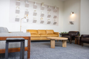 The lobby of the main medical building integrates with the overall aesthetics of the campus, which draws inspiration from nature. The project team envisioned a unique display of ceramic art created by local artists, taking inspiration from Maine’s natural beauty. Nine ceramic artists from the region were selected to be part of the permanent display, which is showcased in custom display shelving. Mey & Co also produced a coffee table book, available in the lobby space, to tell the story of the collaboration and the artists who created the work.