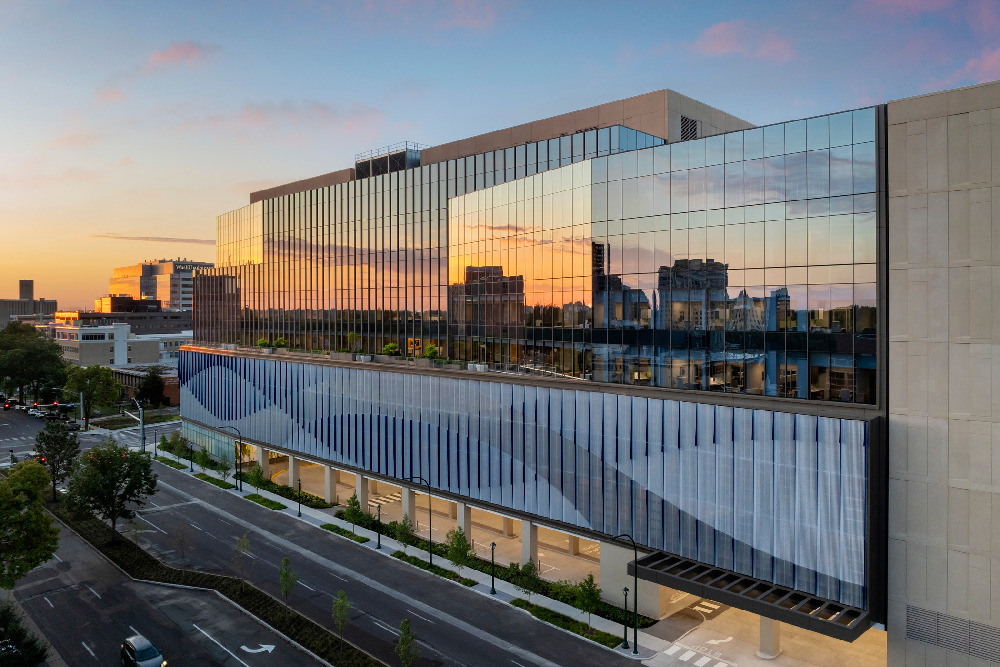 An intuitive, welcoming arrival sequence anchors the Gary C. Werth Cancer Center’s design, with three levels of integrated parking across the nine-story building. Photo credit: Andrew Rugge/Perkins Eastman