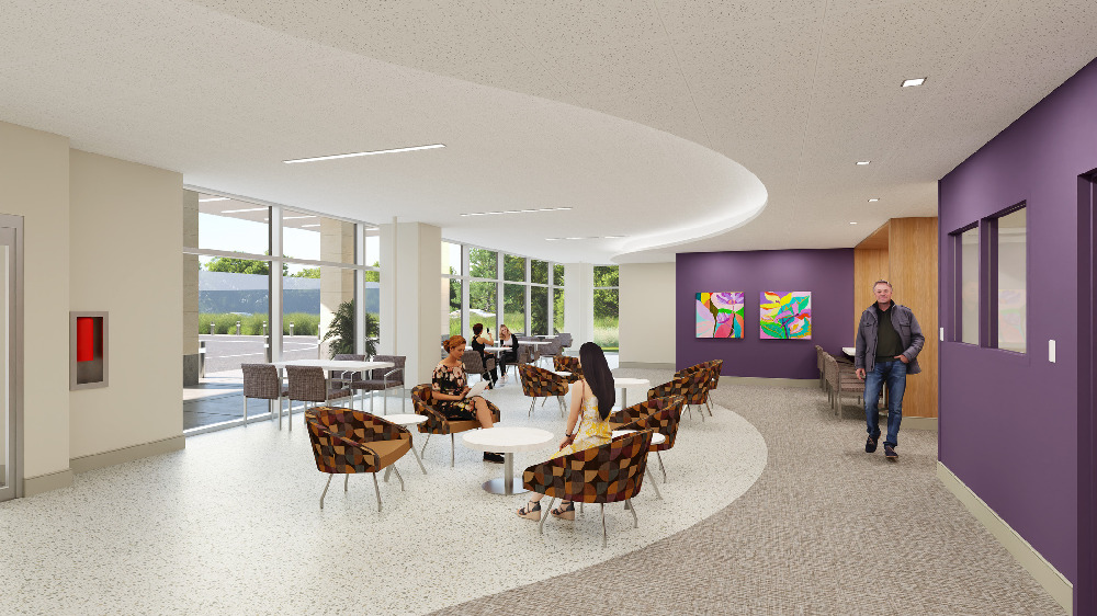 Patient comfort and convenience are a focal point of the facility’s interior design, which includes 101 exam rooms and 88 private infusion rooms. Inspired by elements of hospitality design, the spaces feel nurturing and comfortable, allowing patients and their families to experience the healing power of nature through natural daylighting, warm wood tones and upgraded finishes and lighting, and soft ceiling elements. Nourishment stations, electric fireplaces, cozy seating and tables for playing games and crafting while undergoing treatment are also included.